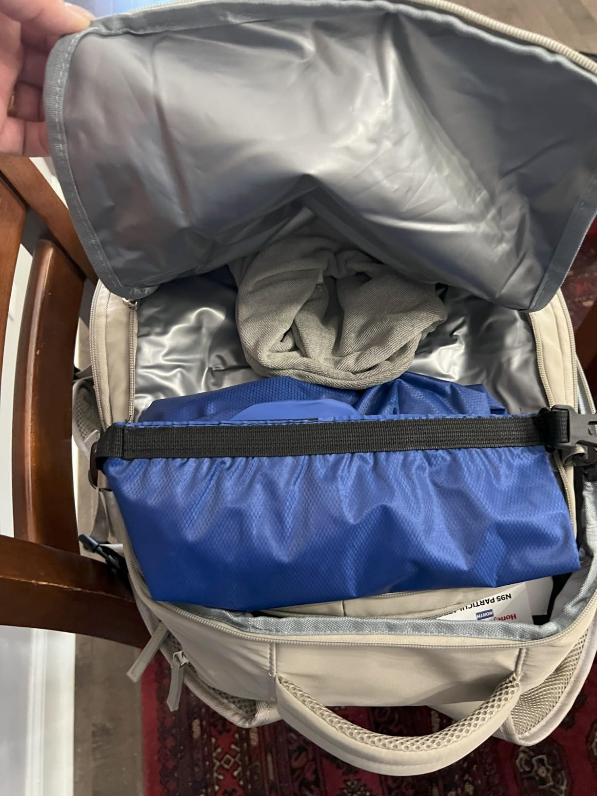 Me agarró una lluvia fuerte llegando al aeropuerto y todo adentro quedó seco. El material impermeable sí funciona.