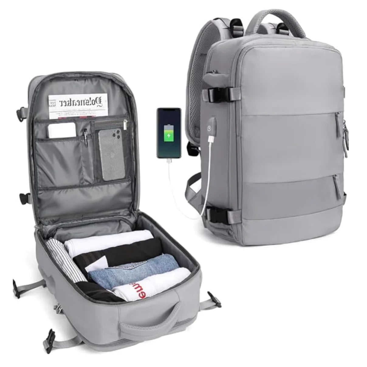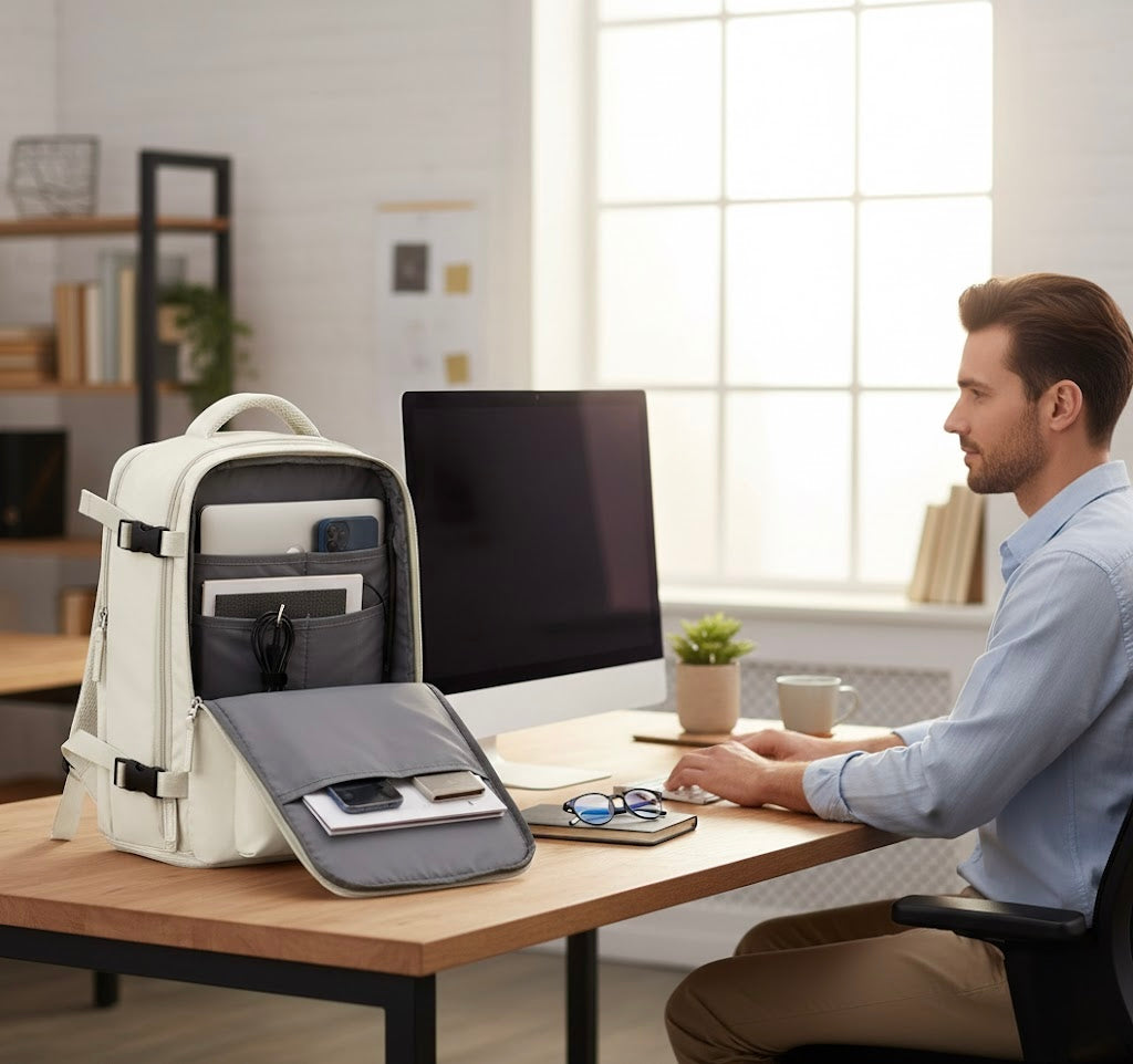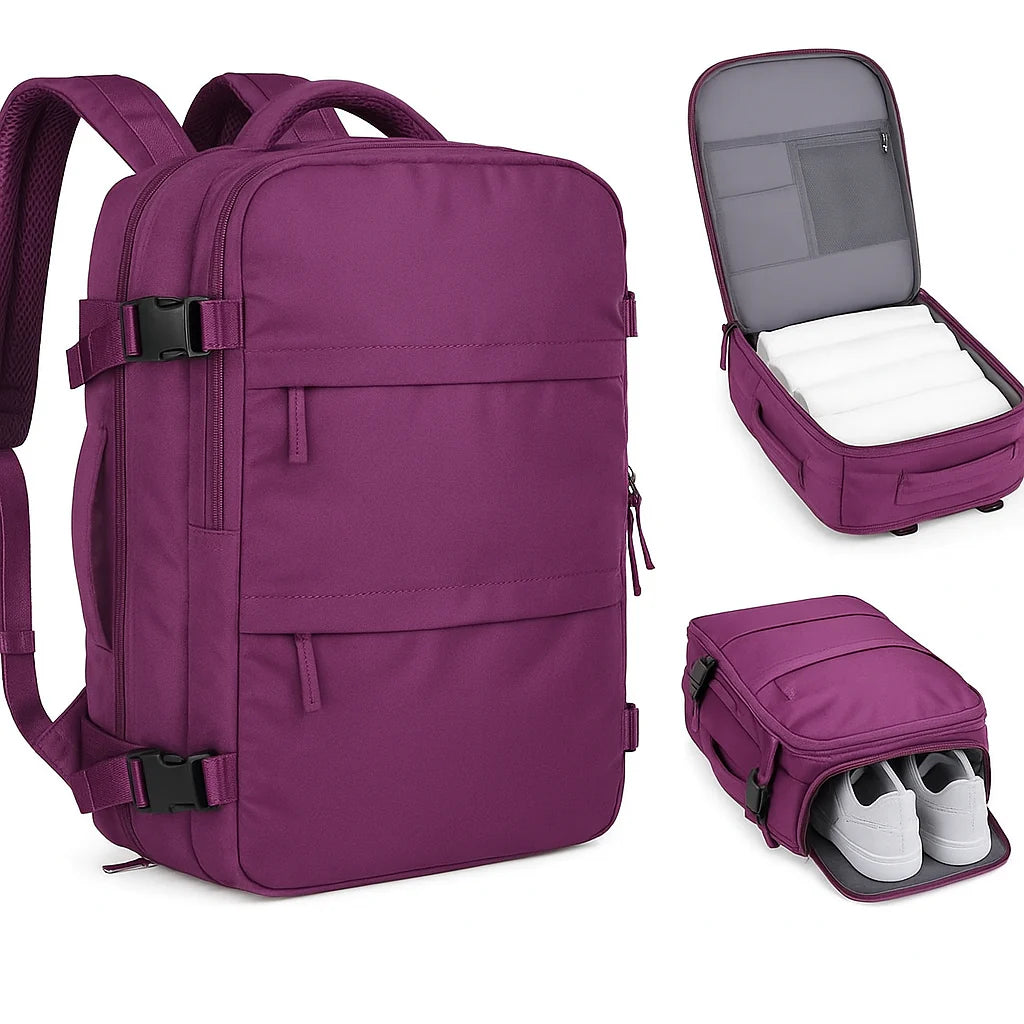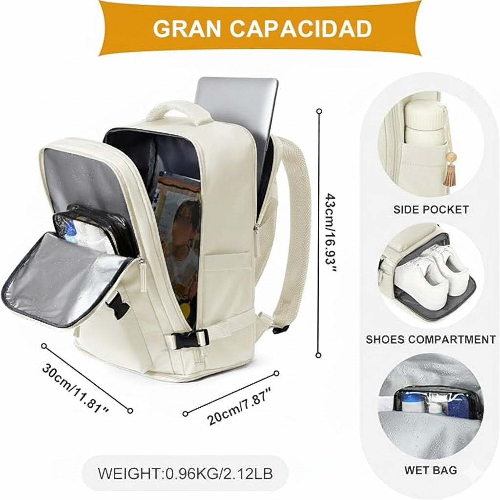 Incluye múltiples bolsillos: • Compartimento para laptop • Bolsillo para zapatos • Espacios para ropa y accesorios • Bolsillo externo de fácil acceso • Bolsillo antirrobo oculto. Todo queda ordenado y fácil de encontrar.